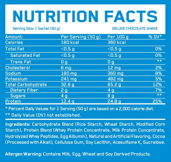 Съставки: Въглехидратна смес (оризово нишесте, пшенично нишесте, модифицирано царевично нишесте), протеинова смес (концентрат на суроватъчен протеин, концентрат на млечен протеин, хидролизирани суроватъчни пептиди, яйчен албумин), смес от анаболен активатор (L-левцин, L-изолевцин, L-валин), Аминоподдържаща смес (L-глутамин, L-глицин, L-лизин, L-метионин, L-фенилаланин, L-треонин, L-триптофан), мултивитаминова смес (бета-каротин, холекалциферол, DL-алфа токоферил ацетат, аскорбинова киселина , тиамин, рибофлавин, ниацин, пантотенова киселина, пиридоксин HCL, цианокобаламин, фолиева киселина, биотин, витамин К (като фитонадион), естествени и изкуствени аромати, целулоза Gym, соев лецитин, суркалоза, ацесулфам К