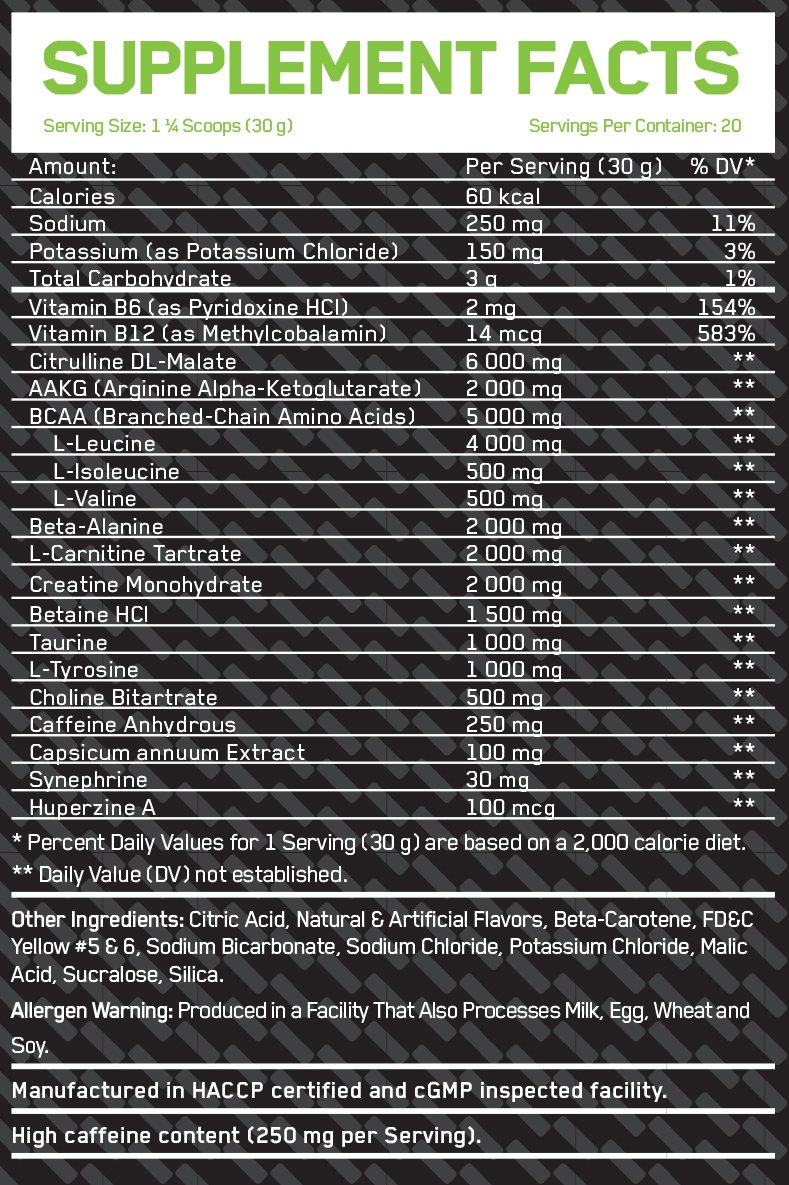 Начин на приемане: Смесете 2 мерителни лъжици с 335-475 мл. вода или течност по Ваш избор. Консумирайте 20-30 минути преди тренировка.