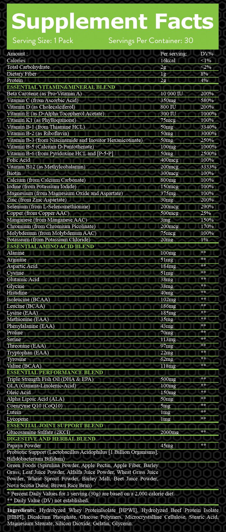 В този продукт за добавени над 23 витамина и минерала, като всички те покриват 100% от дневната нужда на организма от макронутриенти. Витамин А, С, D, Е, В6 и В12 са добавени тук, като всички те са от изключително значение за правилното протичане на всички процеси в тялото. Те са органични съединения, биологически активни вещества, които са есенциални за всеки човешки организъм.