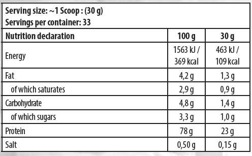 Всяка 30г доза доставя 23,5 гр белтъци ( при някой вкуса повече/по – малко ), които допринасят за растежа и поддръжката на мускулната маса, като същевременно подсилва костите – това превръща протеините в едни от най-важните хранителни вещества, особено за всеки, който провежда дългосрочни силови тренировки и/или тренировки за издържливост. Освен това, всяка доза доставя 5гр верижно разклонени аминокиселини и 4гр Л-глутамин, изключително ценни и желани аминокиселини в хранителния режим на всеки здраво-трениращ спортист.